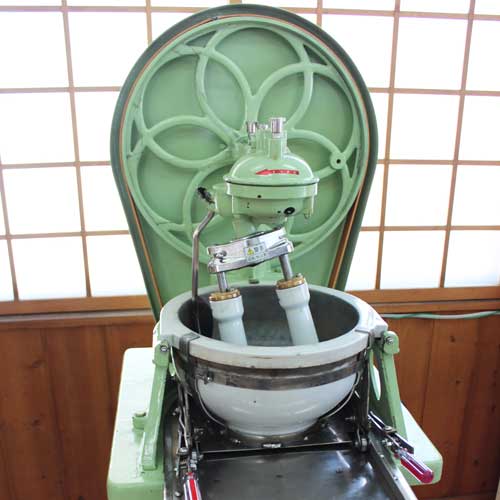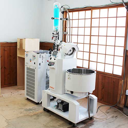 当社の漆精製方法は、従来の熱源によって水分を除去する加熱攪拌方式のくろめ工程を、減圧装置(ロータリーエバボレーター)で沸点を下げて水分除去をする方式です。この方式では、従来の半分以下の時間で、添加物を使用せず、再現性の高い高品質の漆の生産が可能です。また漆から出るテレピン油が直接外部に排出されるため、漆の刺激臭が最低限に抑えられた快適な作業環境です。