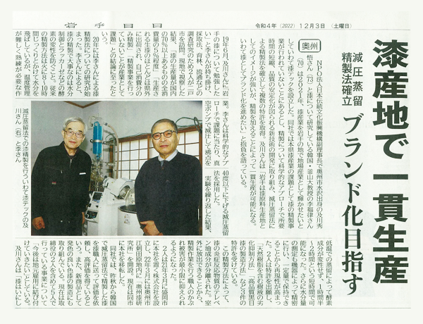 うるしニュース 2022年12月 岩手日日新聞にて記事が掲載されました 2022.12.03 お知らせ 令和4年12月3日の岩手日日新聞にて、いわて漆テックの記事が掲載されました。いわて漆テックでは、減圧蒸留法という新しい技術で漆を精製する手法... 続きを読む